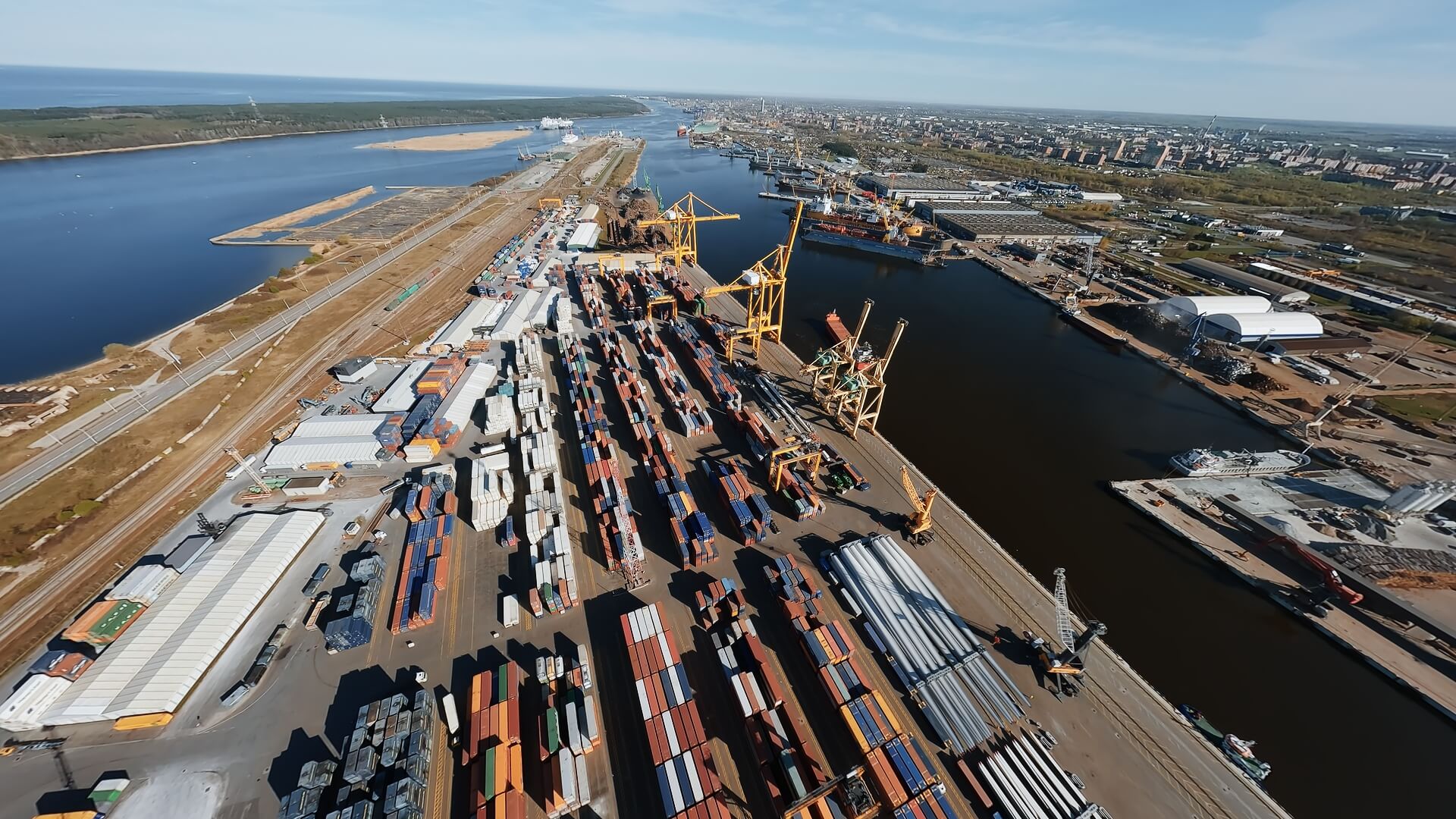 Drono kadrai iš „Ignitis Renewables“ projekto, kuriame fiksuojamas vėjo jėgainių komponentų transportavimas iš Klaipėdos jūrų uosto į būsimą parką Lietuvoje. Vaizde matyti pirmasis logistikos etapas – nuo iškrovimo uoste iki gabenimo specializuotu transportu per miesto infrastruktūrą.
